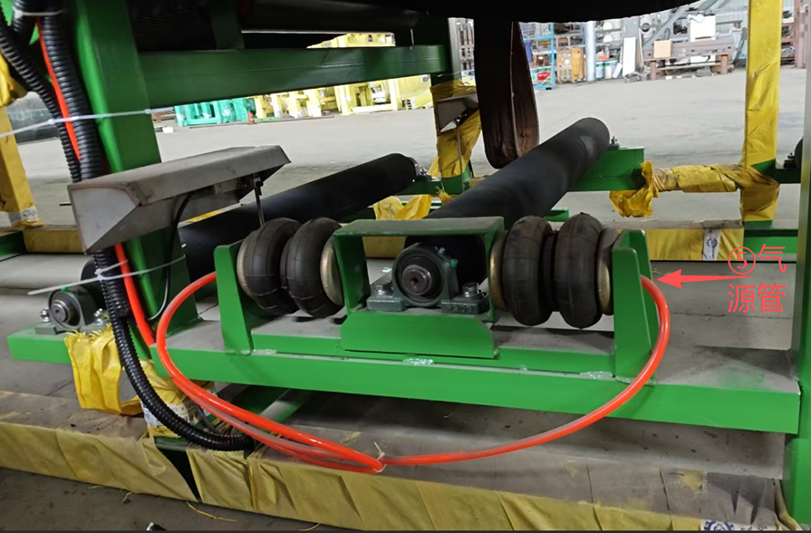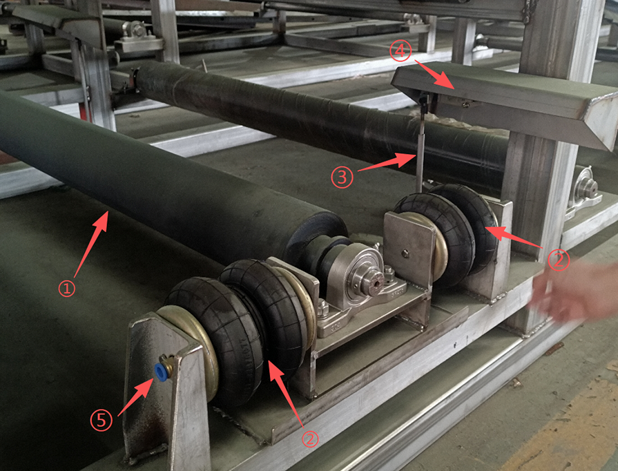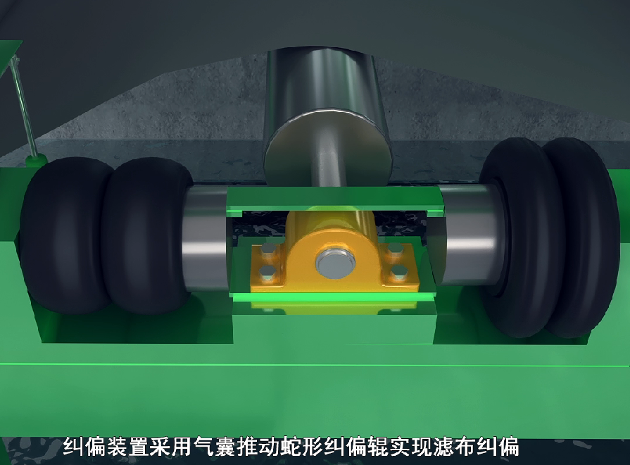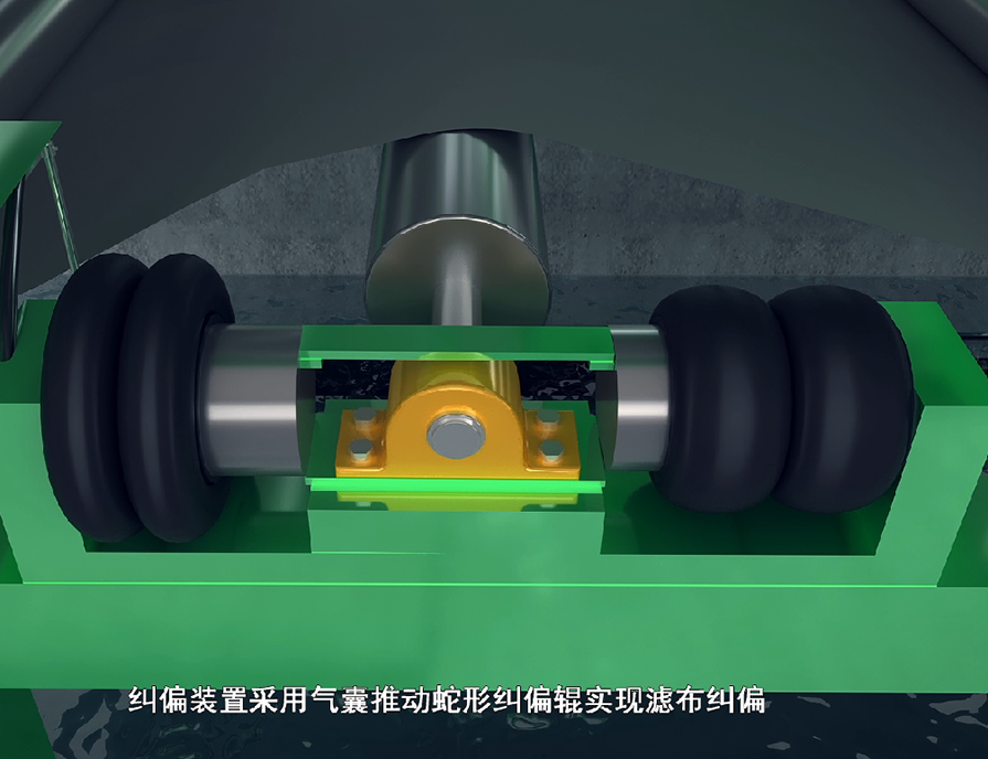 在正常運轉中,濾布是不會碰到糾偏裝置的檢測桿。當濾布跑偏時,濾布會碰到檢測桿,檢測桿偏移,自動糾偏裝置中的氣囊會一側充氣,一側放氣,帶動糾偏輥蛇形偏移,使濾布改變偏移方向,恢復到正常運轉軌跡。