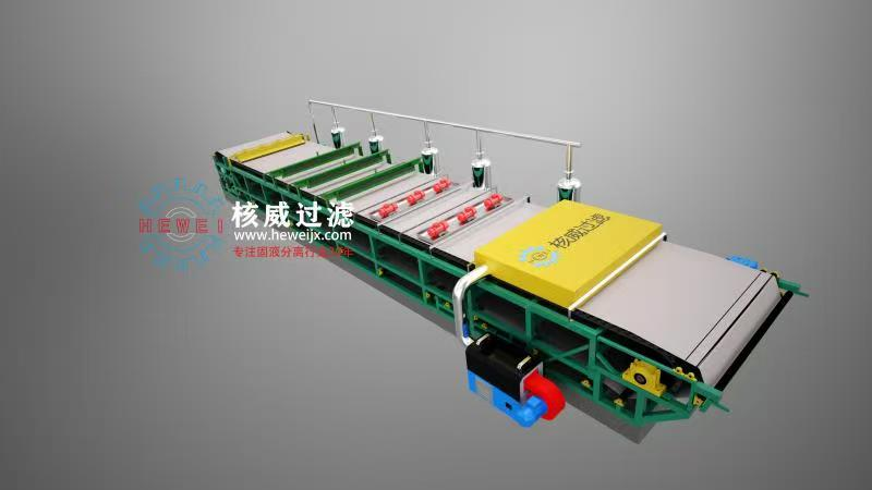 真空帶式過濾機以環(huán)形過濾帶為介質,通過真空系統(tǒng)產生負壓實現(xiàn)固液分離,整個過程分為漿料分布、真空過濾、清洗提純、自動卸料四個連續(xù)階段,完美適配膨潤土漿料的處理需求。首先,經提純或鈉化改性后的膨潤土漿料通過進料裝置均勻分布在運行的過濾帶上,進料裝置的攪拌機構可防止固體顆粒沉降,避免局部濾層過厚或過薄影響分離效果;隨后濾帶攜帶漿料進入真空吸濾區(qū),真空盒產生的-0.04~-0.08MPa負壓將漿料中的液體快速抽離,膨潤土顆粒被濾帶截留形成連續(xù)濾餅,通過多段真空室梯度調壓,實現(xiàn)前端快速脫水、后端深層脫水的效果;若需提升產品純度,清洗區(qū)的噴淋裝置可噴灑清水或專用洗滌劑,去除濾餅表面殘留的可溶性雜質,洗滌液單獨收集避免交叉污染;最后濾帶運行至卸料區(qū),通過卸料輥張力變化和彈性刮刀完成自動卸料,清潔后的濾帶循環(huán)進入下一輪作業(yè),實現(xiàn)24小時連續(xù)運行。